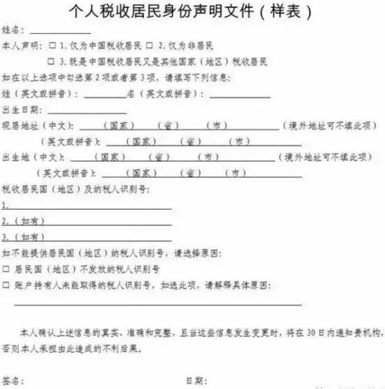 根據(jù)調(diào)查辦法的規(guī)定,從今年7月1日起,個人在金融機(jī)構(gòu)開立新賬戶時,應(yīng)提供稅收居民身份聲明文件。具體解釋就是用來作為識別賬戶持有人是否為非居民個人。