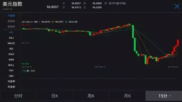 在市場表現(xiàn)方面(以下市場表現(xiàn)均截至北京時(shí)間3:30分),與今年3月加息時(shí)的走勢相似,美元指數(shù)再次出現(xiàn)大幅波動(dòng)的情況。在美聯(lián)儲(chǔ)公布利率決議前半個(gè)小時(shí)左右,美元指數(shù)突然出現(xiàn)大幅跳水,一度從97.07點(diǎn)跌至96.32的低點(diǎn)。在耶倫新聞發(fā)布會(huì)開始后,美元指數(shù)快速反彈至96.81點(diǎn)附近。